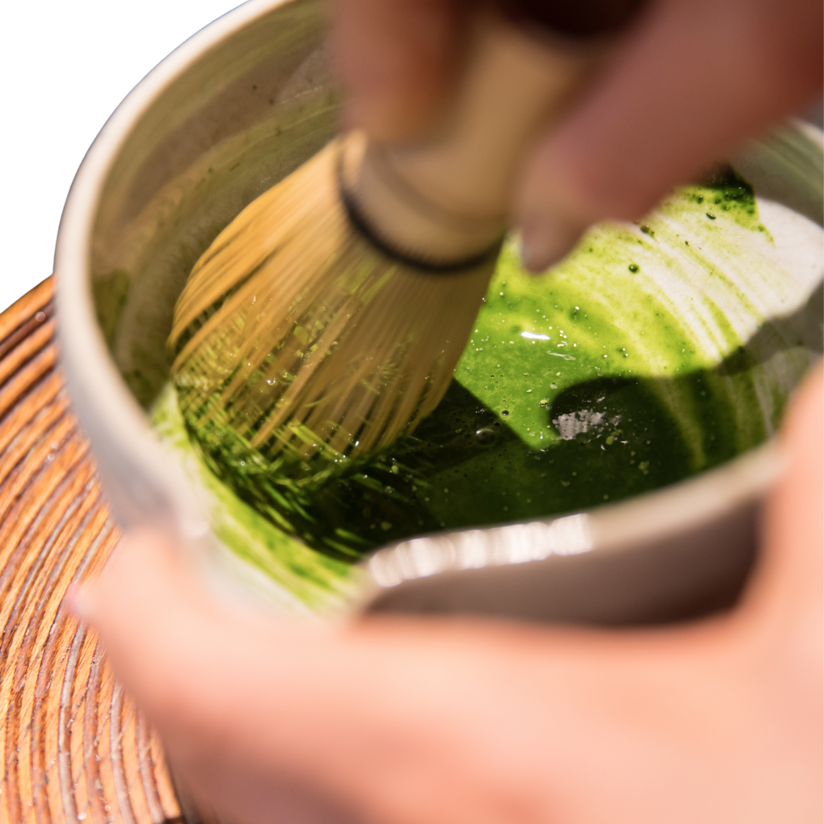 מוסיפים מעט מים חמים (לא רותחים – כ־70–80°C) ומקציפים בתנועות W מהירות בעזרת מקציף במבוק (chasen) או מקציף חשמלי – עד שנוצר קצף עדין.